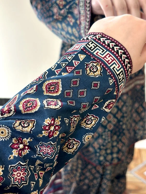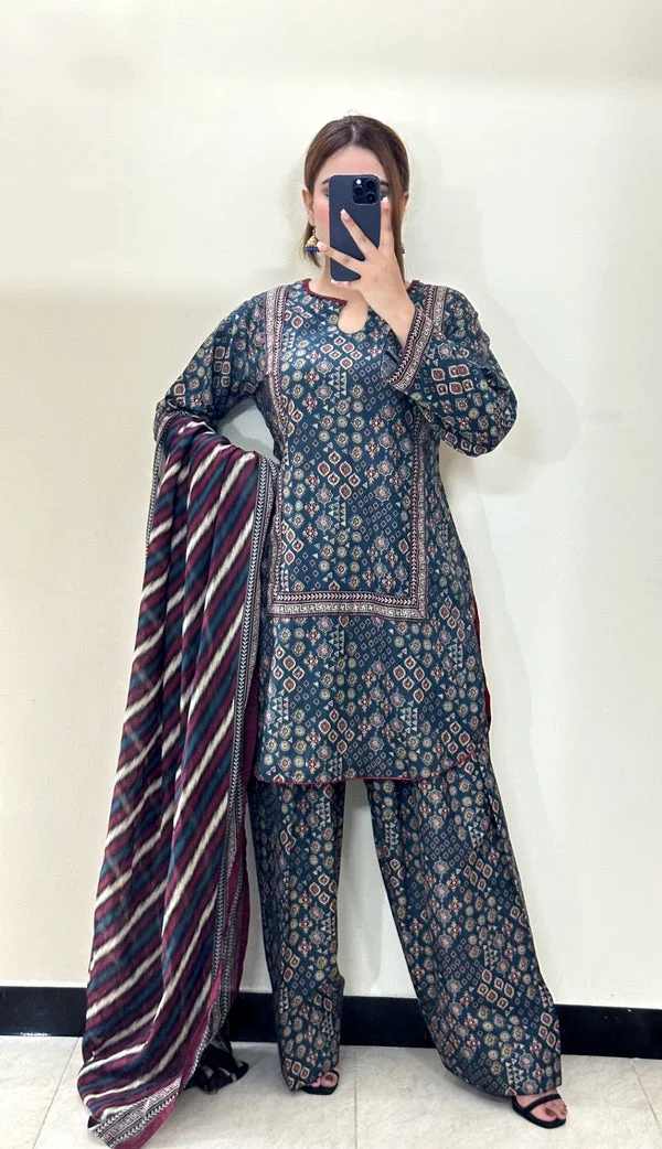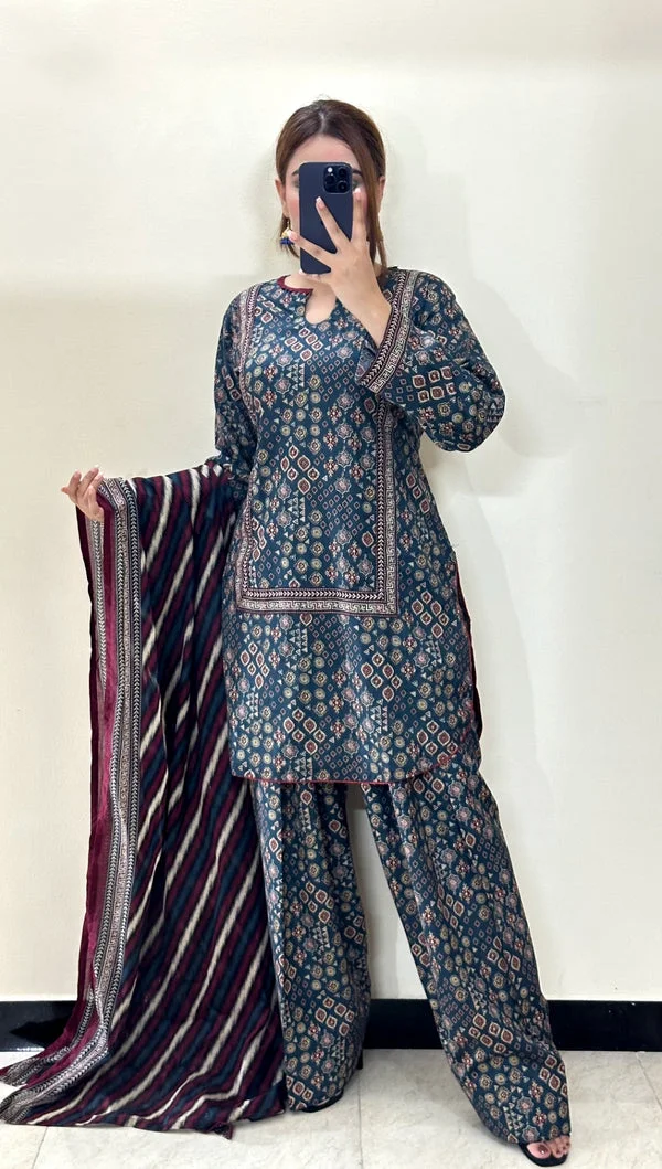 এথনিক প্রিন্ট ও কনট্রাস্ট স্ট্রাইপড ওড়নার সুন্দর কম্বিনেশনে তৈরি এই থ্রি-পিস সেটটি আপনার দৈনন্দিন লুককে করে তুলবে আরও স্টাইলিশ ও ক্লাসি।