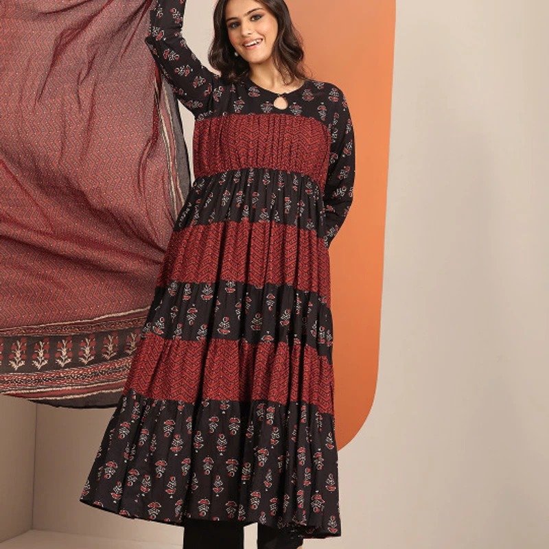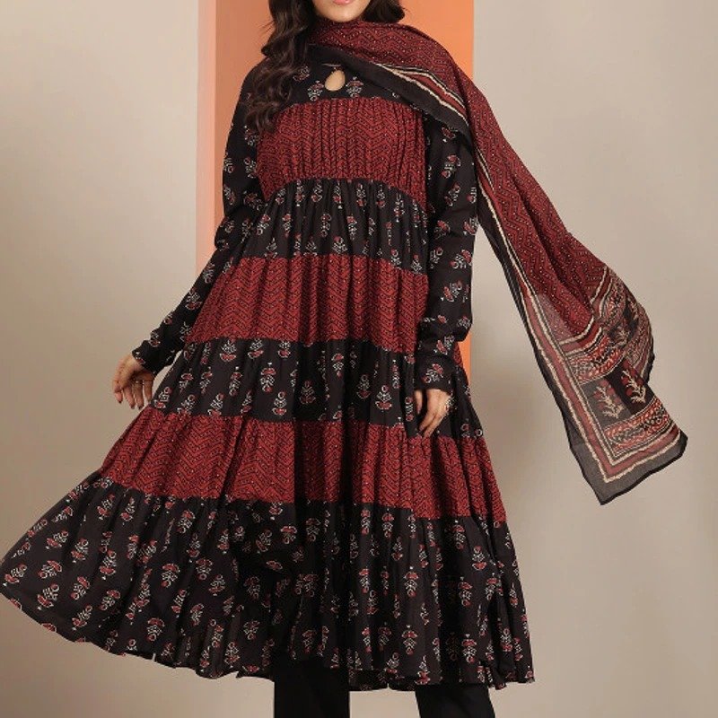Be the first to review “Premium Pure Cotton Anarkali Gown Kurta three Piece Set Midnight Maroon Tiered”